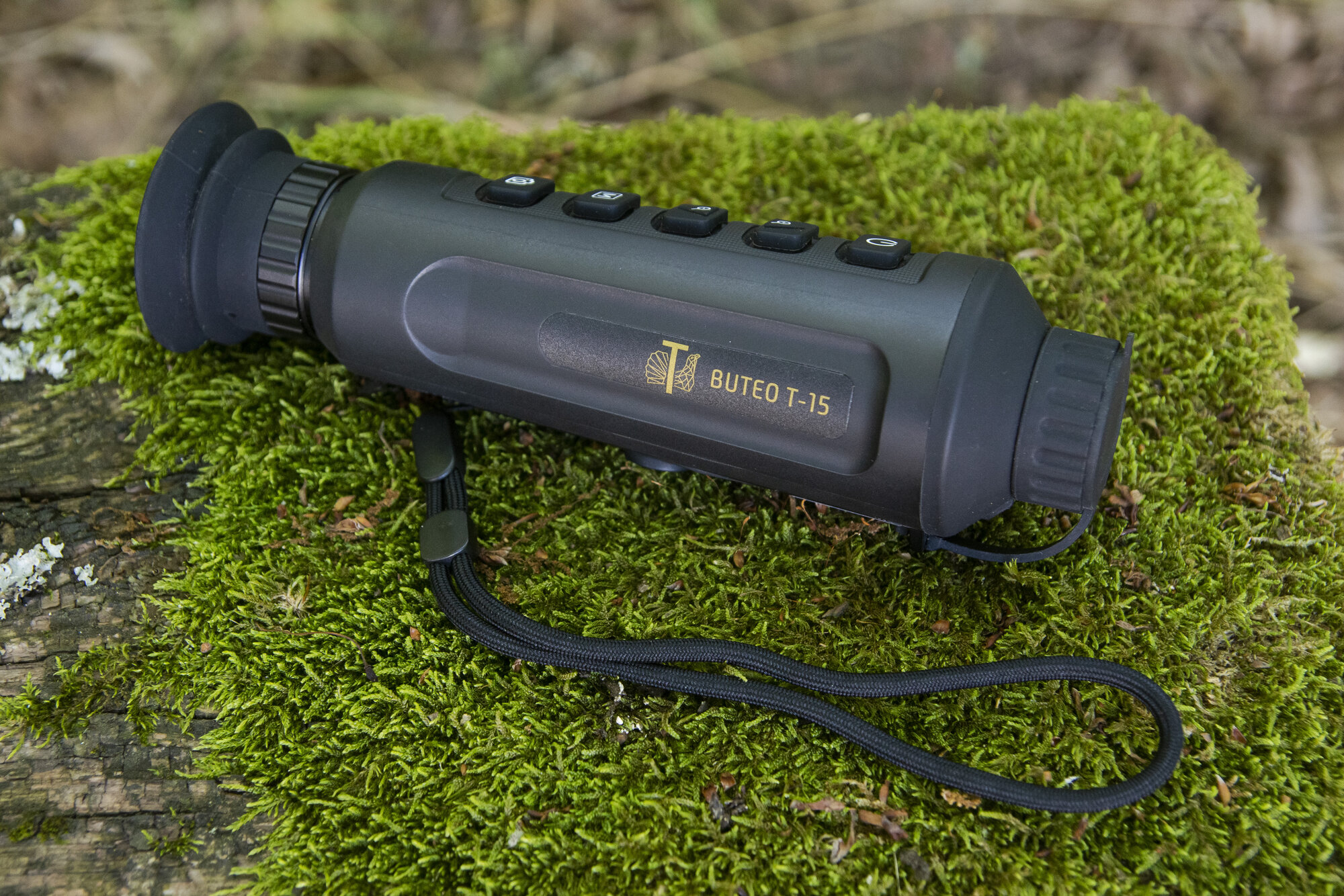 Na horní části těla monokuláru najdete pětici rozměrných tlačítek s dostatečnými mezerami mezi sebou, abyste je nahmatali a dokázali vzájemně odlišit i potmě. Ve spodní části našel své místo kovový závit pro instalaci termovize na stativ a USB port pro dobíjení chráněný krytkou. Všechny ovládací prvky výrobce pečlivě utěsnil, což propůjčuje T-15 odolnost na úrovni IP67 (plná ochrana vůči prachu a voděodolnost při ponoření do hloubky 1 m po dobu 30 minut). Nechybí textilní poutko, jímž si Buteo přichytíte k zápěstí a nepřijdete o něj ani při zaškobrtnutí na posedu.